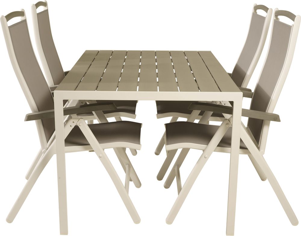 Matgrupp med ett bord och 4 stycken stolar. Stolarna är tillverkade av Aluminium/Aintwood/Textilene och bordet är tillverkat av Polywood/Aluminium.