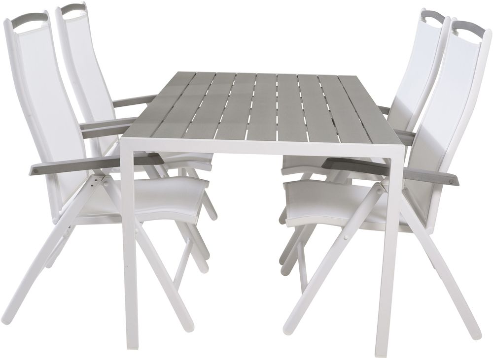 Matgrupp med ett bord och 4 stycken stolar. Stolarna är tillverkade av Aluminium/Aintwood/Textilene och bordet är tillverkat av Polywood/Aluminium.