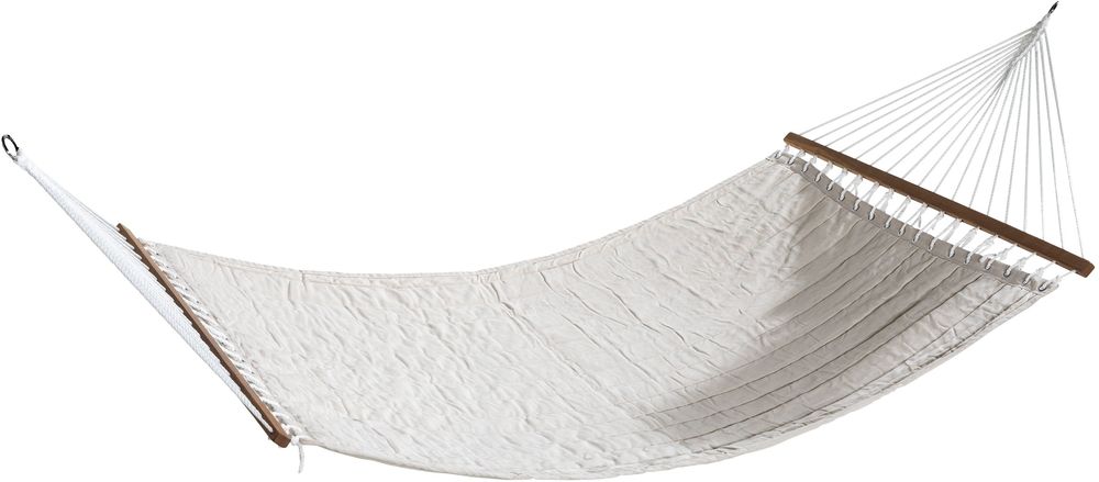 Hängmatta i gräddvitt tyg med träkant i båda ändarna, samt vita rep som går igenom träkanterna och sitter fast i var sin metallring.