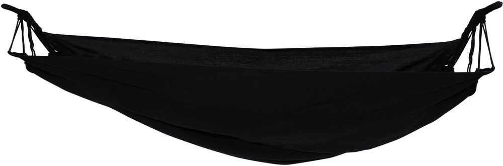 Hängmatta i svart tyg med träkant i båda ändarna, samt vita rep som går igenom träkanterna och sitter fast i var sin metallring.