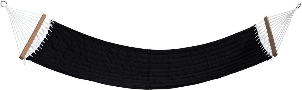 Hängmatta i svart tyg med träkant i båda ändarna, samt vita rep som går igenom träkanterna och sitter fast i var sin metallring.