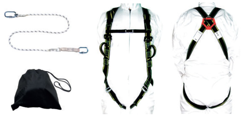 Fallskyddssele med två infästningspunkter samt säkerhetslina.