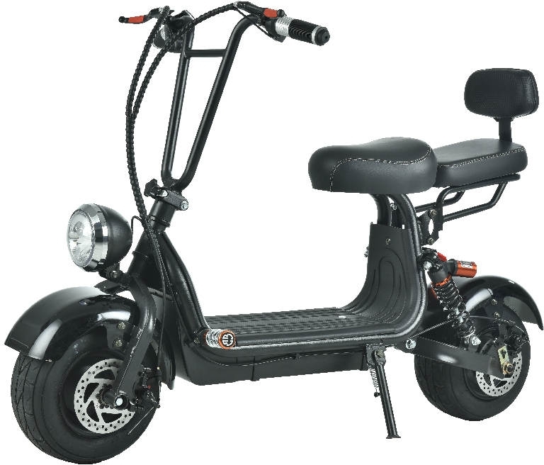 Elscooter 800w med något retroinspirerad design tar dig smidigt fram i en maxhastighet på 32 km/h. Det kan kännas tryggt att inte komma upp i höga hastigheter. Du sitter bekvämt på den fjädrade flexibla skumgummi sitsen, som är beklädd med anti-halkfritt läder och håller i de ergonomiskt designade handtagen. Här har du även handbroms och vid mörkrets infall har du en stor framlykta till ditt förfogande. Extrasätet ger dig möjlighet att ta med en vän eller ett större bagage (max vikt 105 kg).
