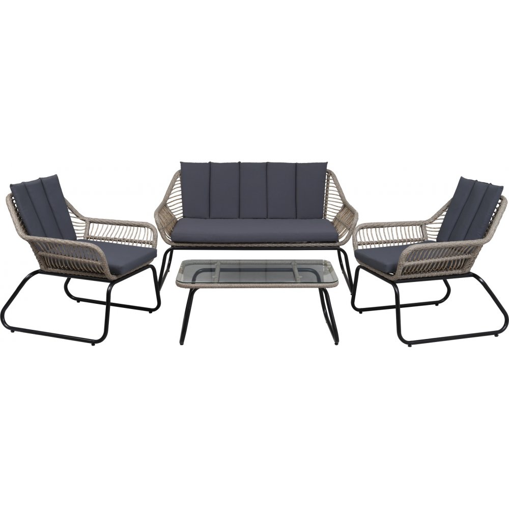Florens utegrupp i grå konstrotting (7 mm) med matchande mörkgrå dynor av polyester. Väderbeständig stomme av metall, pulverlackerad i svart. Bordet har en toppskiva av härdat glas.