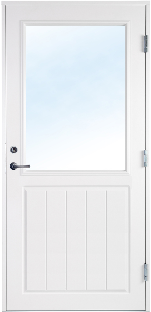 Dörren är dekorerad nedtill på både in- och utsida. Fönstret är en 2-glas isolerruta med Argon vilket ger ett lågt U-värde.