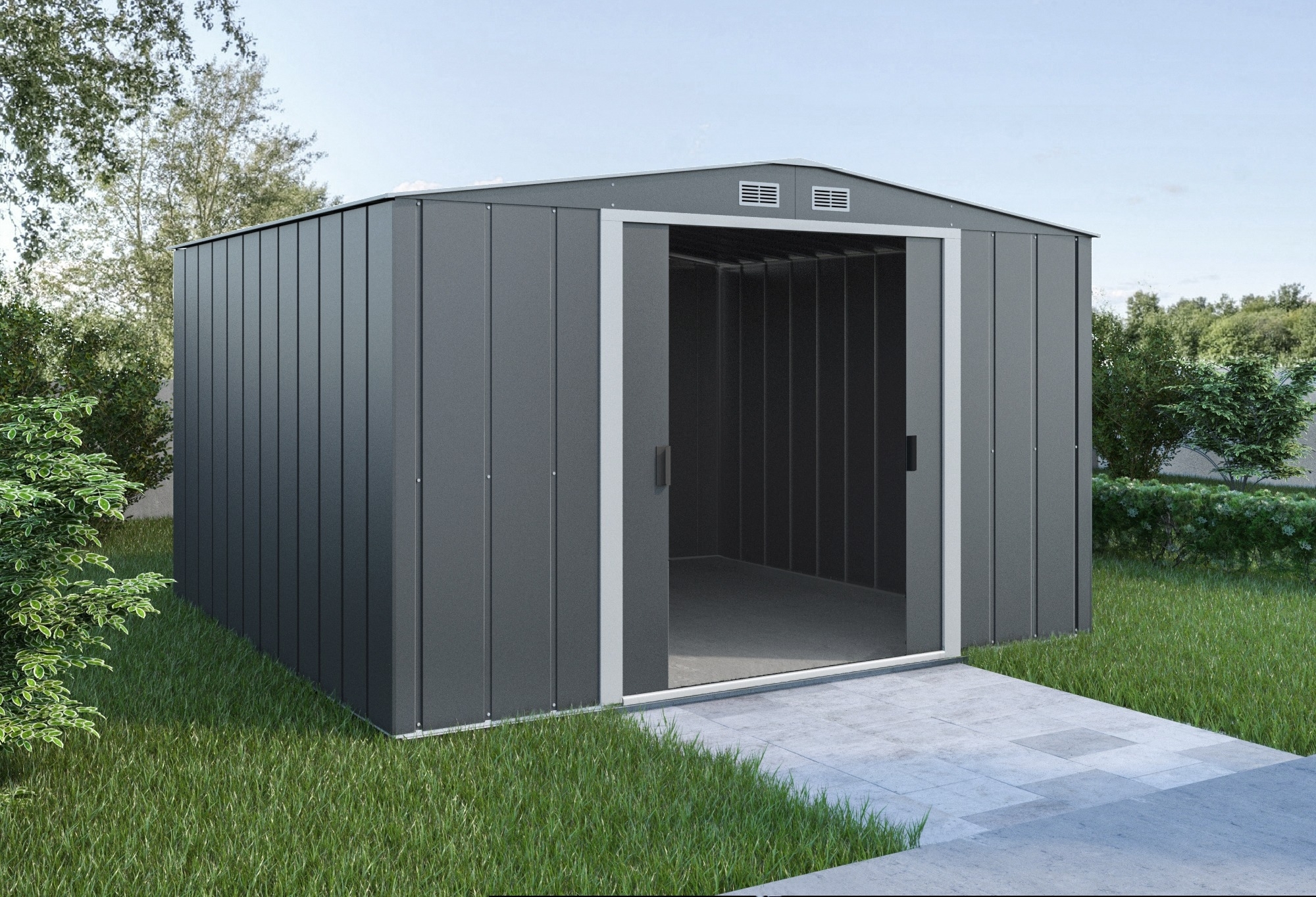 Förrådet är lättmonterat med väggar, tak och ram i galvaniserad stål som utgör en stabil konstruktion med långvarigt rostskydd. Fronten är försedd med 2 luftventiler för en bra luftcirkulation och 2 skjutdörrar för att ta så lite plats som möjligt vid öppning. Skjutdörrarna har praktiska handtag som gör det möjligt för dig att använda hänglås.