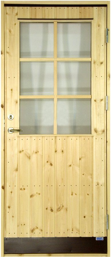 Förrådsdörr med glas och spröjs (inklusive karm och låskista) från Furuhälls Snickeri avsedd för förråd/lokal som ej uppvärms till mer än +18°C. Vid högre temperatur kan dörrens form påverkas.