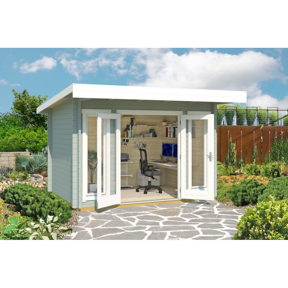 Denna stuga finns i fem olika storlekar. Utrustade med stora långsmala fönster och helglasade dubbeldörrar.