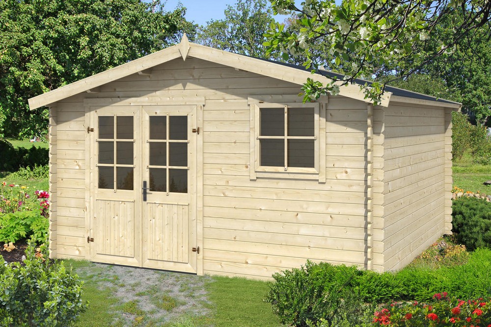 Friggebod Teddy har en klassisk enkel design med fina detaljer i form av en timmerstuga. Dubbeldörrarna har stora fönster med spröjs som tillsammans med fönstret gör stugan charmig, samtidigt som de släpper in ett härligt ljus.