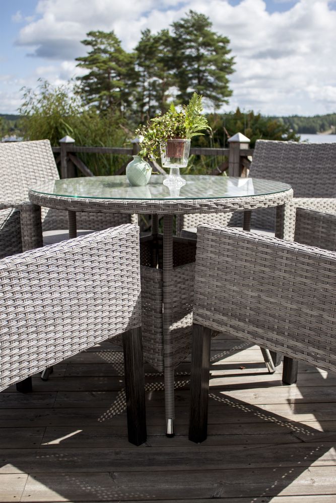 Matbord tillverkat av metall med konstrotting och toppskiva av glas.