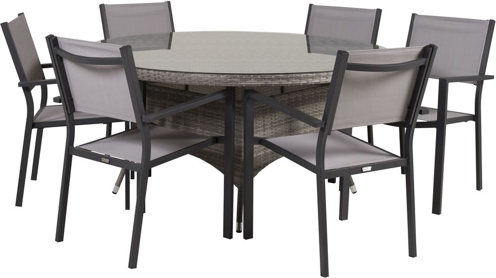 Matgrupp med ett bord och 6 stycken stolar. Stolarna är tillverkade av Aluminium/Textilene och bordet är tillverkat av Glas/Aluminium. Stolarna är stapelbara.