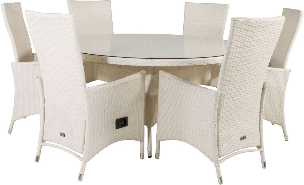 Matgrupp med ett bord och 6 stycken stolar. Stolarna är tillverkade av Konstrotting/Aluminium och bordet är tillverkat av Glas/Aluminium. Dynor ingår.