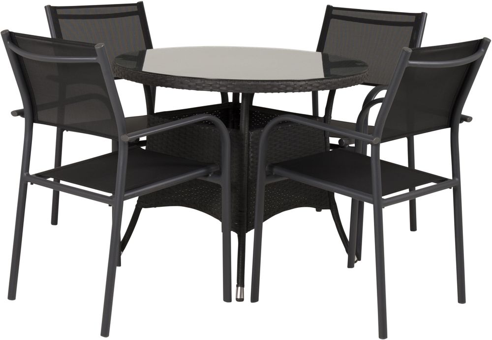 Matgrupp med ett bord och 4 stycken stolar. Stolarna är tillverkade av Aluminium/Textilene och bordet är tillverkat av Glas/Aluminium. Stolarna är stapelbara.