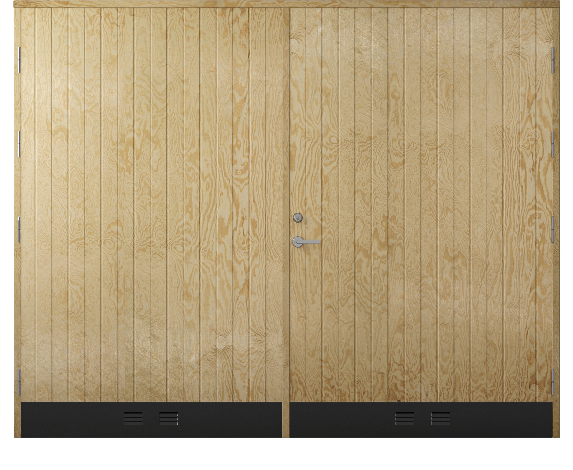 Garageporten har en stabil stomme av furu som bär upp portarna med gångjärn av metall och glas. Dörrbladen är uppbyggda med massiv trästomme (furu) och modern effektiv värmeisolering i 44 mm cellplast med ett skikt av 8 mm vattentät plywood på vardera sida. Utsidan har en fin spontad panel i furu som påminner om våra traditionella träportar. För extra täthet är portarna försedda med silikonlist kring karmens kanter. Sparkplåten på portarnas nedre kant skyddar portarna mot stötar och nederbörd som studsar mot marken och upp på trät.