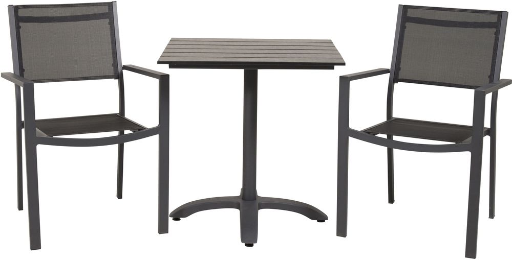Matgrupp med ett bord och 2 stycken stolar. Stolarna är tillverkade av Aluminium/Textilene och bordet är tillverkat av Aintwood/Aluminium. Stolarna är stapelbara.