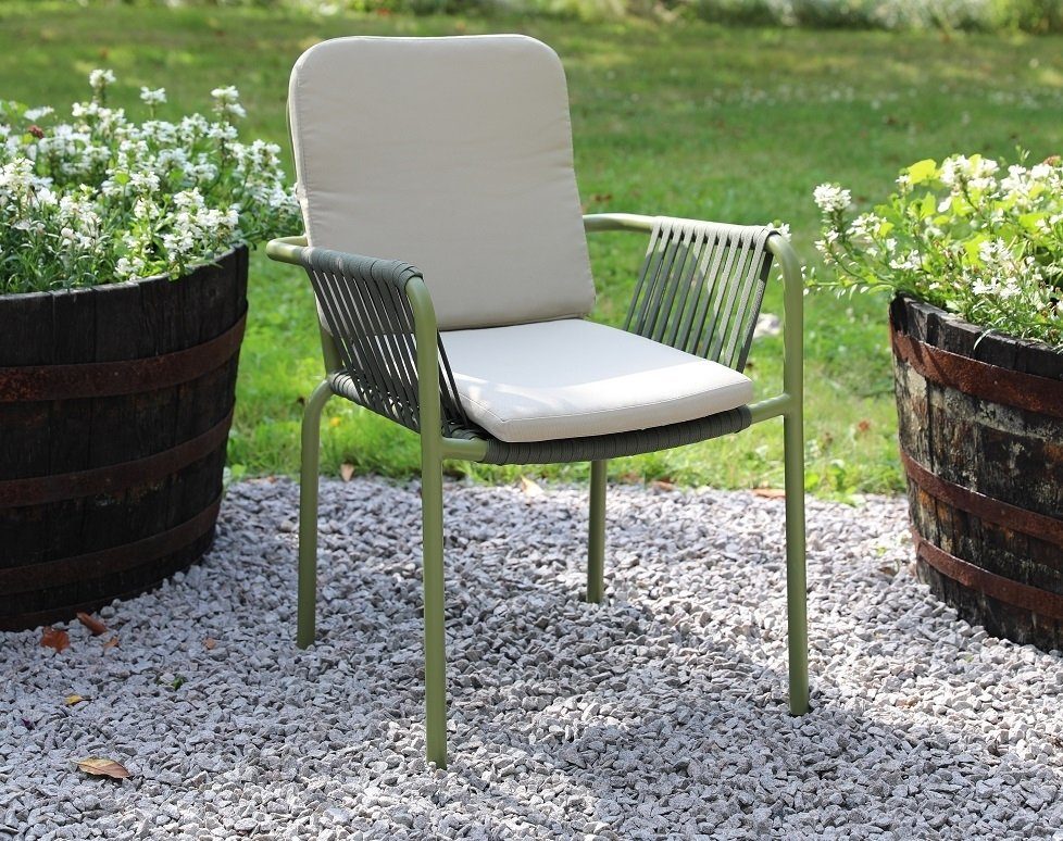 Grön trädgårdsstol aluminium utomhus stapelbar med beige dyna