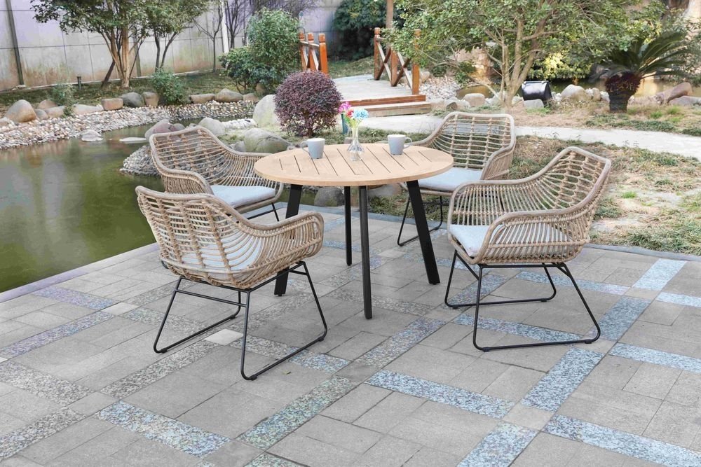 Matgrupp i naturfärgad konstrotting med underrede i svart metall. En kombination som gör sig bra ihop.