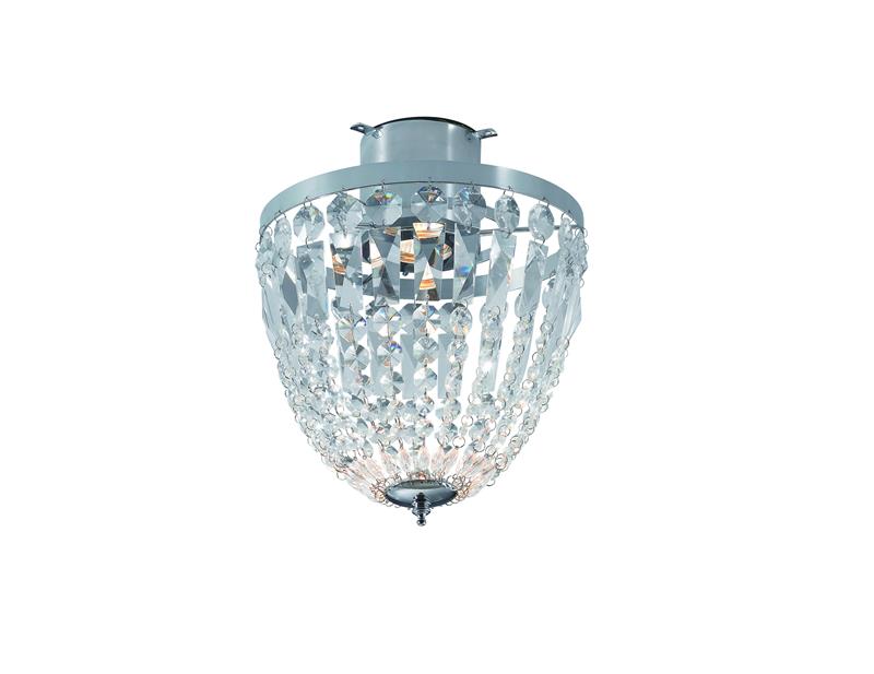 Stilren taklampa, anpassad för badrummet. Kromad metallbas med vackra prismor i klar kristall. GU10 för max 35W. Hängs upp med takbygel. Simpel montering av lampan i badrummet.