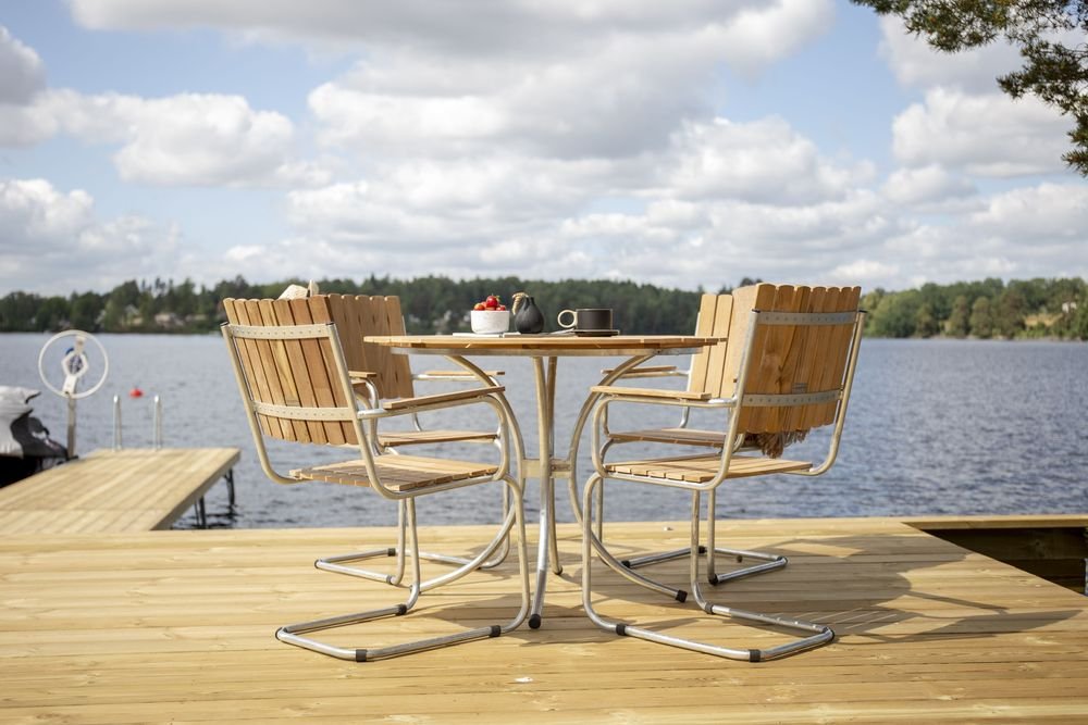 Klassisk matgrupp med ett bord och fyra stolar. Tillverkade i metall och teak.
