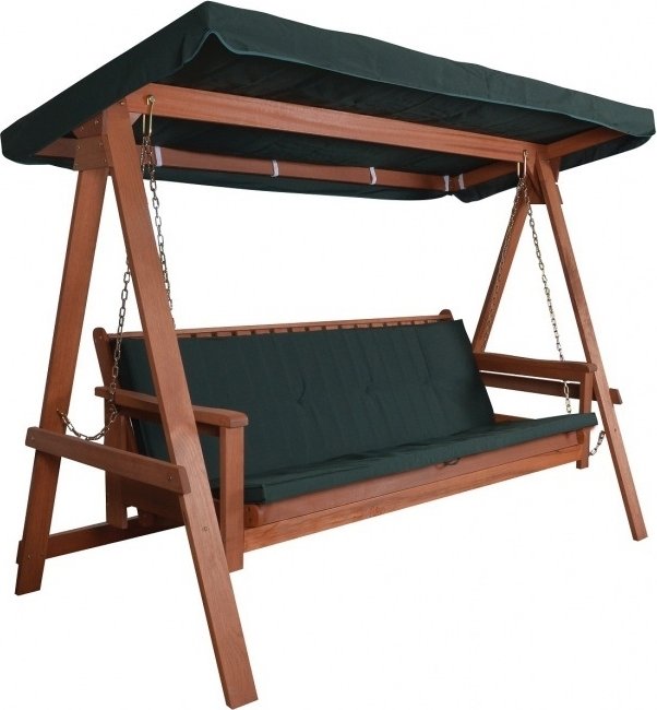 Komplett trädgårdsmöbel med både sittdyna och soltak inkluderat. Hammocken är tillverkad i fint meranti-trä som är ett levande material och bör därav oljas in före användning och utplacering i din trädgård.