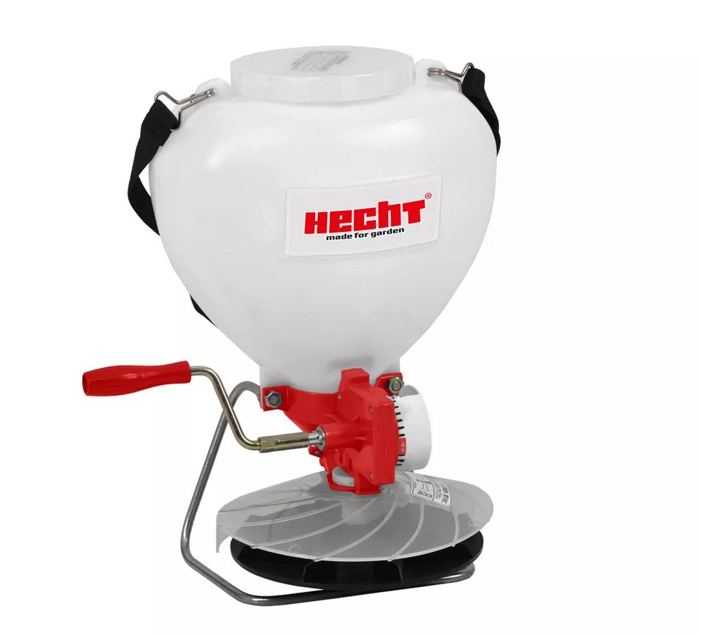 Spridare för applicering av gödningsmedel, frö och salt på vintern. Spridaren rymmer 8 liter.