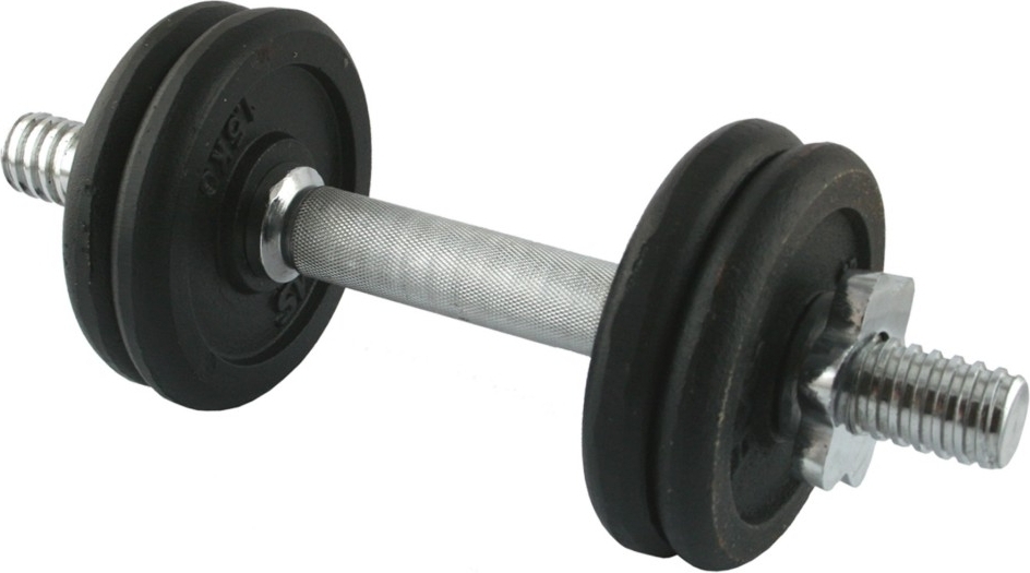 En enkel klassisk hantel med räfflat grepp. I setet inkluderas en nickelpläterad stång och flera svarta vikter i järn.
