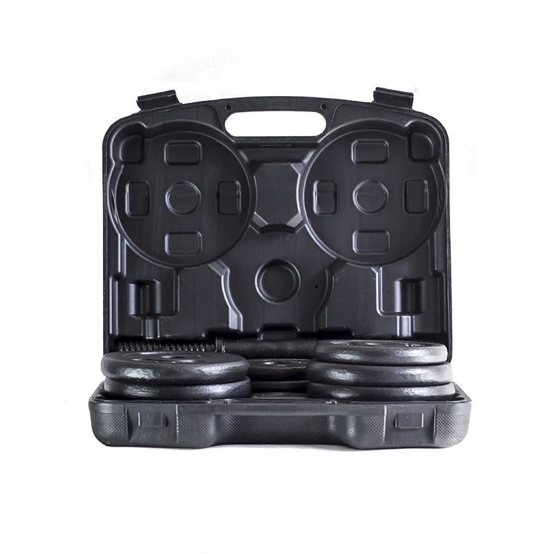 Hantelset i skivstångsmodell med vikter och transportväska.