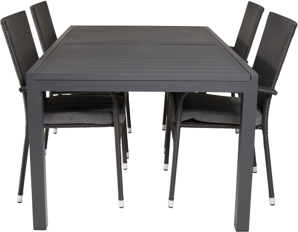 Matgrupp med ett bord och 4 stycken stolar. Stolarna är tillverkade av Konstrotting/polyester och bordet är tillverkat av Aluminium. Dynor ingår.