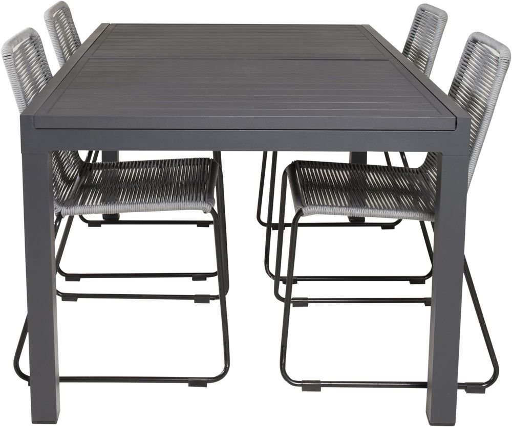 Matgrupp med ett bord och 4 stycken stolar. Stolarna är tillverkade av Stål/Rep och bordet är tillverkat av Aluminium. Stolarna är stapelbara.