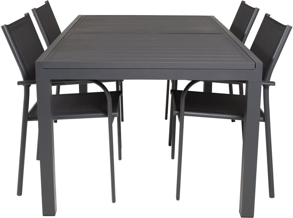 Matgrupp med ett bord och 4 stycken stolar. Stolarna är tillverkade av Aluminium/Textilene och bordet är tillverkat av Aluminium. Stolarna är stapelbara.