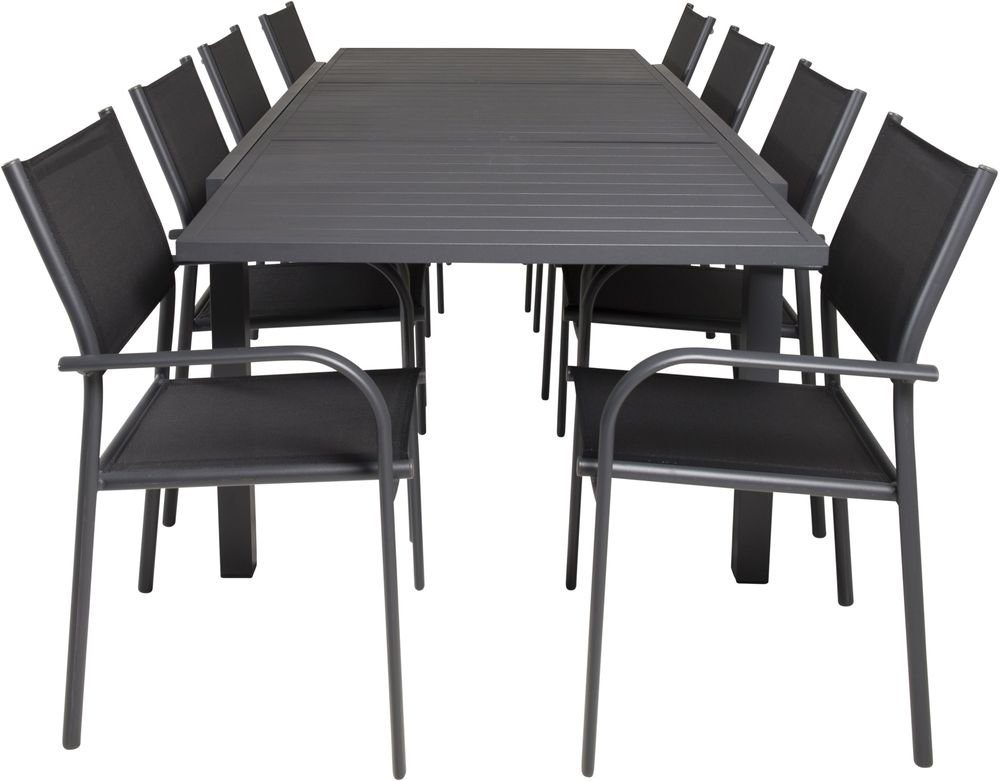 Matgrupp med ett bord och 8 stycken stolar. Stolarna är tillverkade av Aluminium/Textilene och bordet är tillverkat av Aluminium. Stolarna är stapelbara.