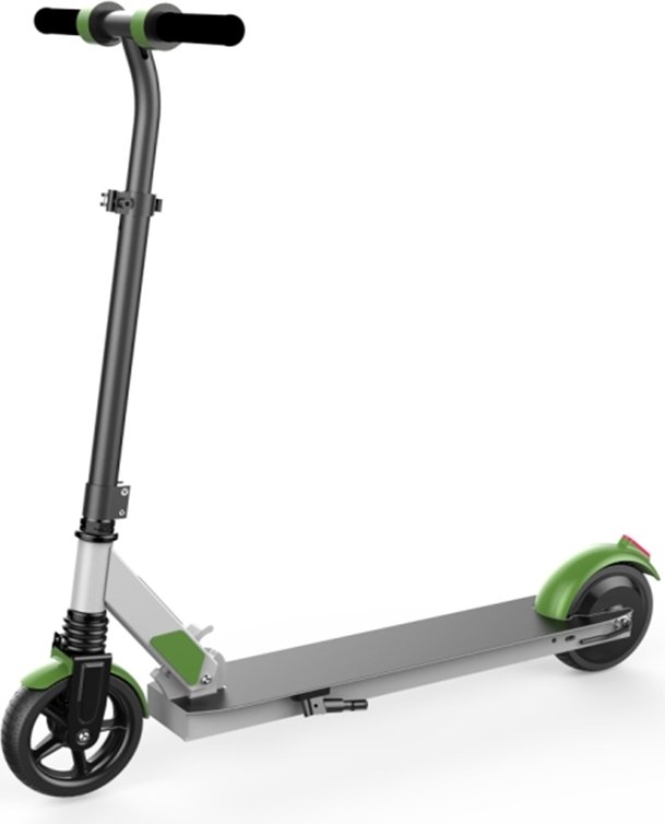 Elektrisk sparkcykel med många finneser och egenskaper, bla hopvikbar design, stöd, tuta och styre med justerbar höjd.