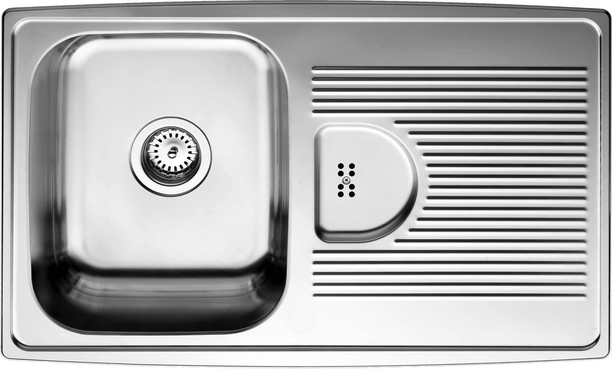- Vänster, korgventil, nedfällning. Diskbänk med en låda och avrinningsplan med extra avlopp för nedfällning, under- eller planlimning