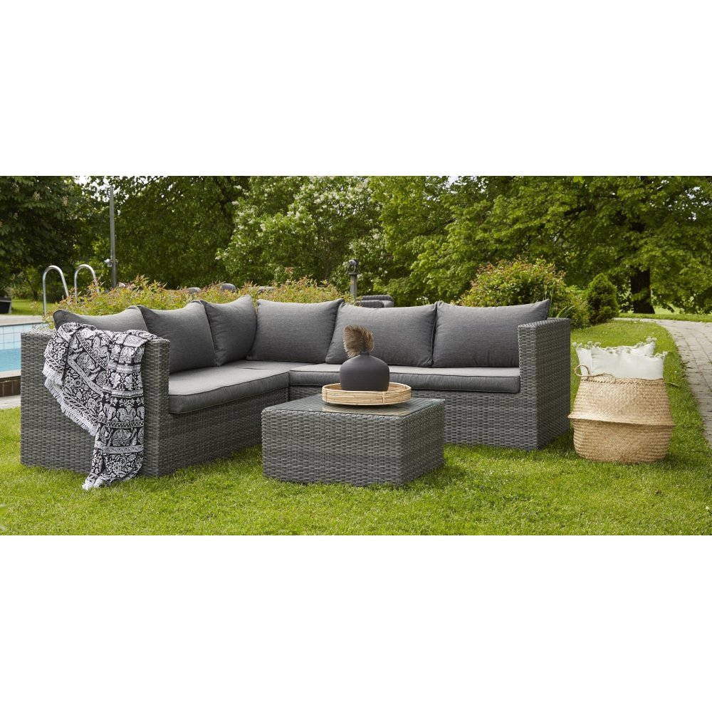 Hörnsoffa loungegrupp utomhus konstrotting grå