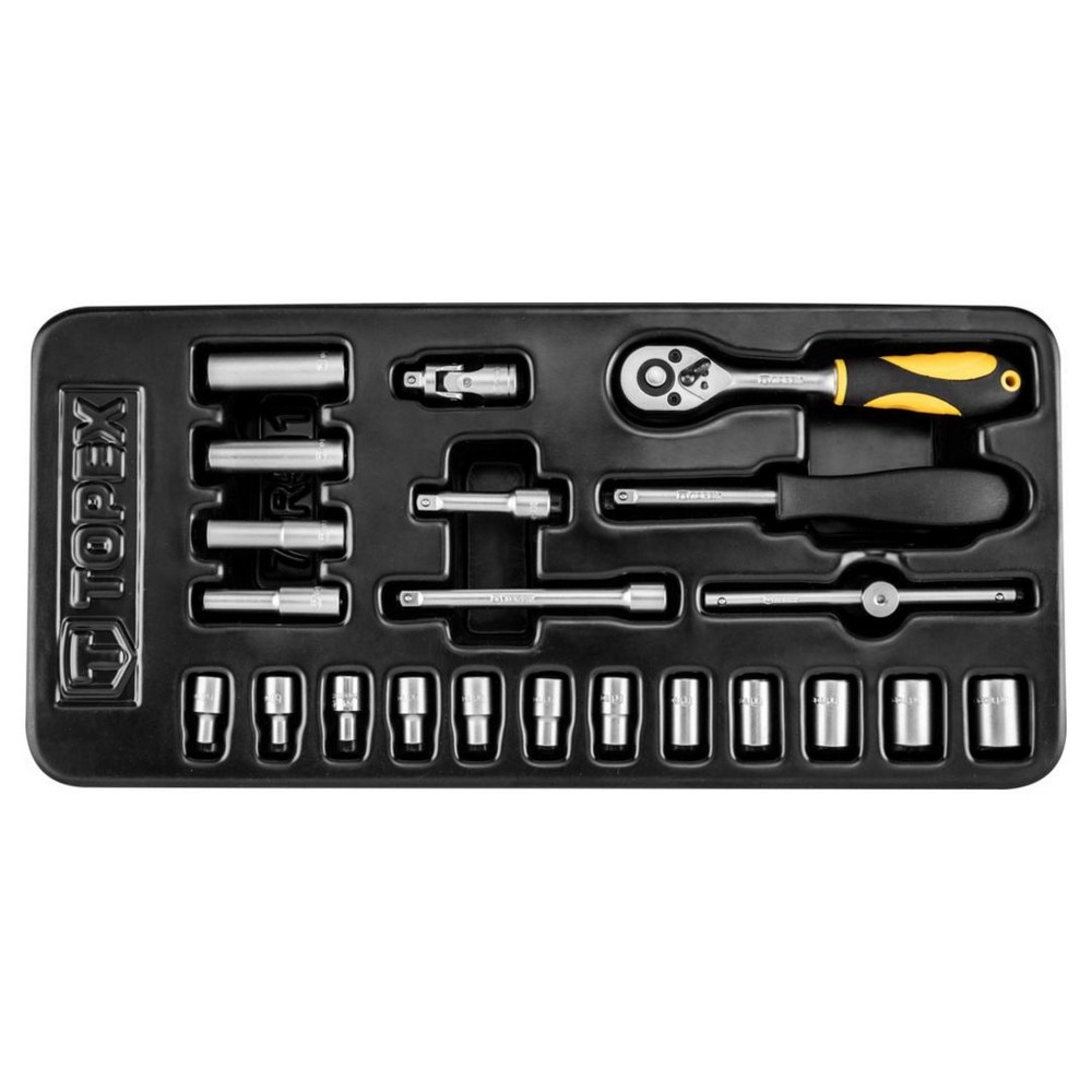 Hylssats med 21 delar sorterade i smidig plasthållare. Samtliga delar är tillverkade i tåligt stål som ger lång livslängd.