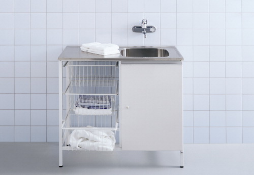 En vacker tvättbänk i många varianter med en rad praktiska detaljer. Bänkplan i mönstervalsad rostfri plåt och en stor tvättlåda. Golvstativ av pulverlackerad plåt med justerbara plastfötter.