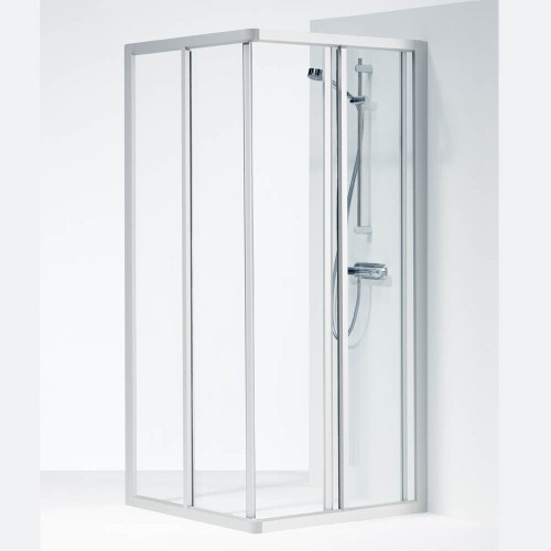 Duschhörna. Hörningång med 2 skjutdörrar. Höjd 1950 mm.