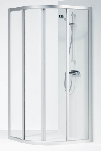 Halvrund duschvägg med 2 skjutdörrar. Ifö Solid duschhörna, modell SVR levereras i klart, screentryckt och rökfärgat härdat säkerhetsglas. Välj mellan vitlackerade alt. naturanodiserade aluminiumprofiler. Storlekar 80x80, 90x90 cm. Höjd 1950 mm.