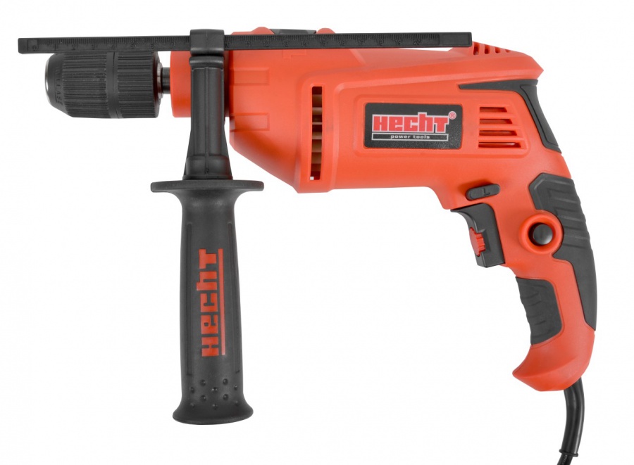 Eldriven slagborrmaskin med variabel hastighet, nyckelfri chuck, extrahandtag och borrdjupmätare.