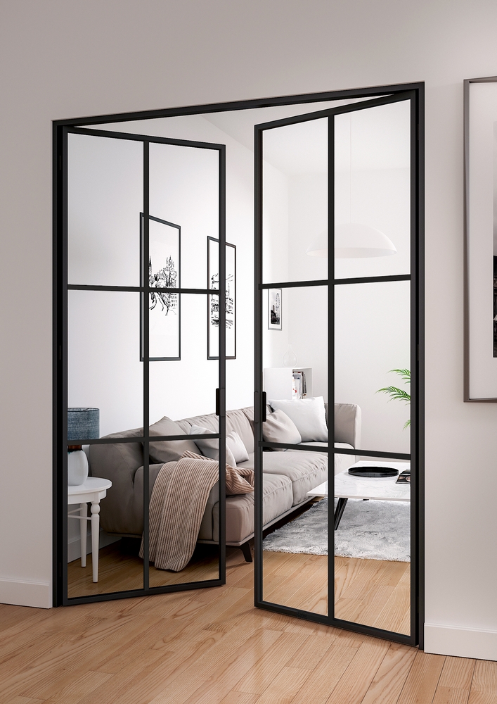 En dubbeldörr i industriell design som passar perfekt om du vill ha en diskret avdelare in till en annan del av rummet men ändå inte vill ha full insyn som du kan få med ett helt glasparti.
