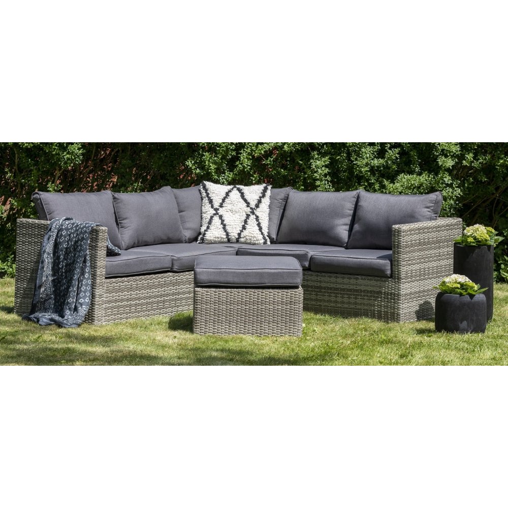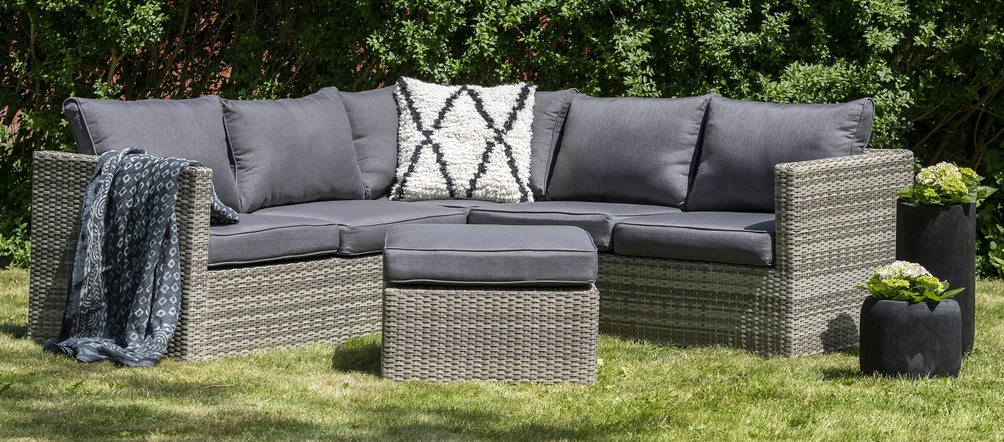 Ingelstorp hörnsoffa i grå konstrotting med matchande fotpall. Ljusgrå dynor med god komfort. Kombinera gärna med något av våra utebord.