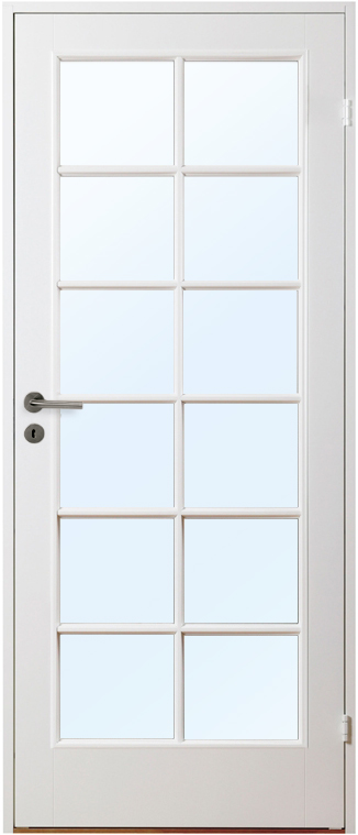 Vitmålad kompakt innerdörr i klassisk spegelindelning för mycket ljusgenomsläpp.