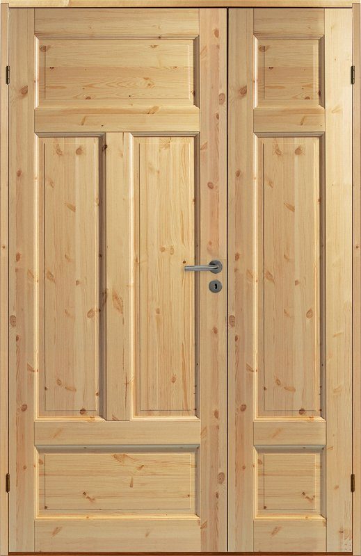 Får du inte plats med en dubbeldörr är detta ett utmärkt val. Dörren är försedd med en smalare sidodörr som gör det möjligt att öppnas upp vid behov. Den obehandlade ytan behöver behandlas med någon form av ytskikt, såsom lasering eller täckmålning. Behandla alltid båda sidor för att dörrarna inte ska slå sig.