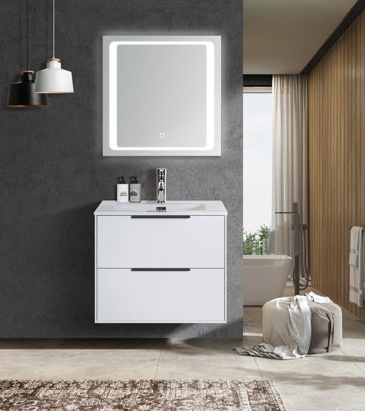 Jacqueline är ett badrumspaket i modern skandinavisk design med kommod, tvättställ och spegel med belysning. Dess vita högglans färg i kombination med enkel design gör att badrumsinredningen passar bra in i en modern miljö.