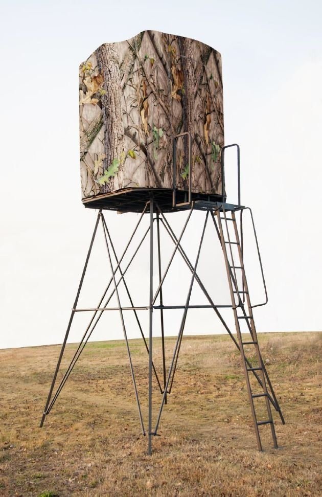 Jakttorn med camouflagemönstrat vind- och regnskydd över plattformen. Tornet är hopfällbart för enkel transportering