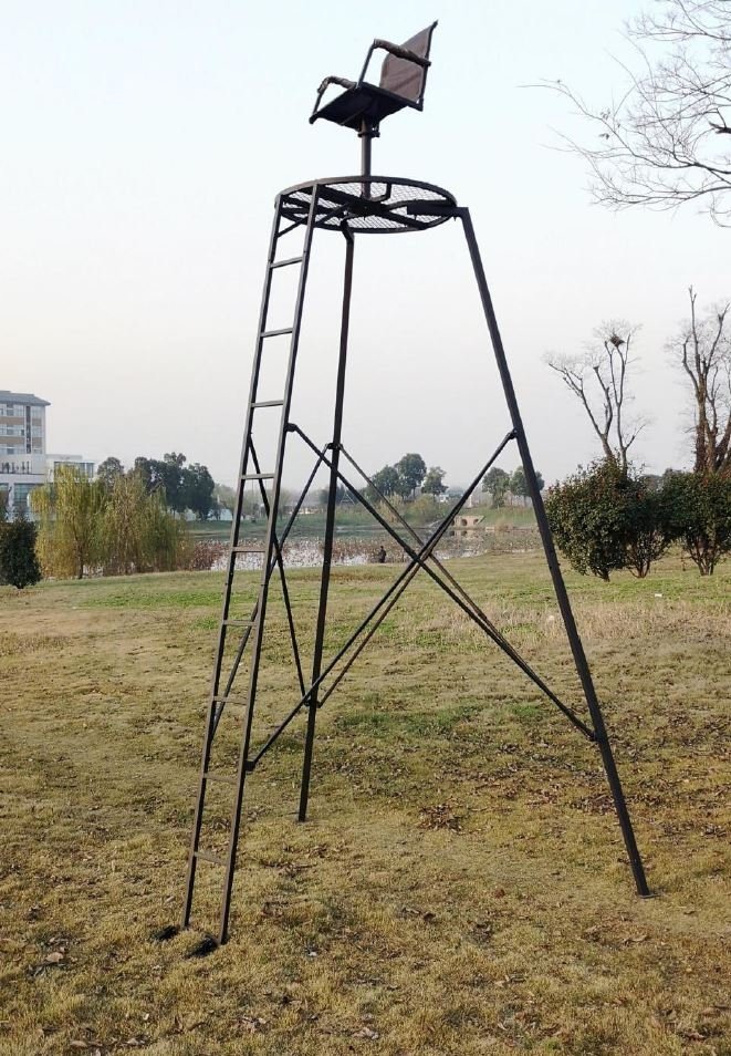 Jakttorn på tre ben, med stol som är vridbar 360°. Tornet är hopfällbart för enkel transportering.