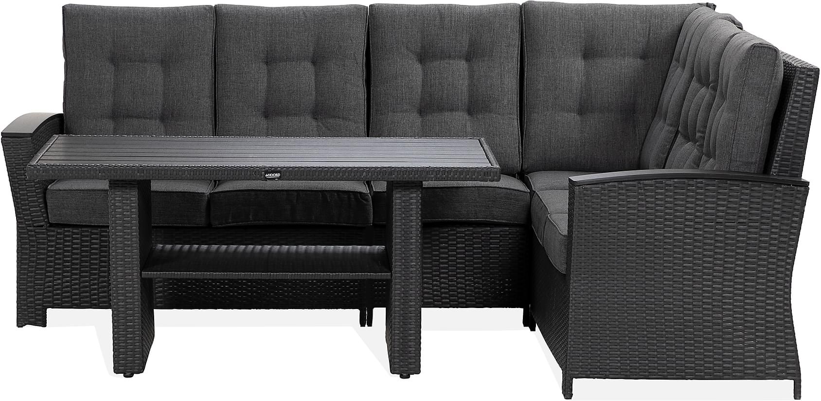Möblerna är tillverkade av konstrotting, ett utmärkt material för utomhusbruk. Den hållbara konstruktionen är väderbeständig och klarar av att stå ute året om. Materialet är i princip underhållsfritt och behöver endast torkas av med en fuktad trasa vid behov. Toppskivan består av aintwood, ett träliknande och lättskött material med en yta som är lätt att torka av.