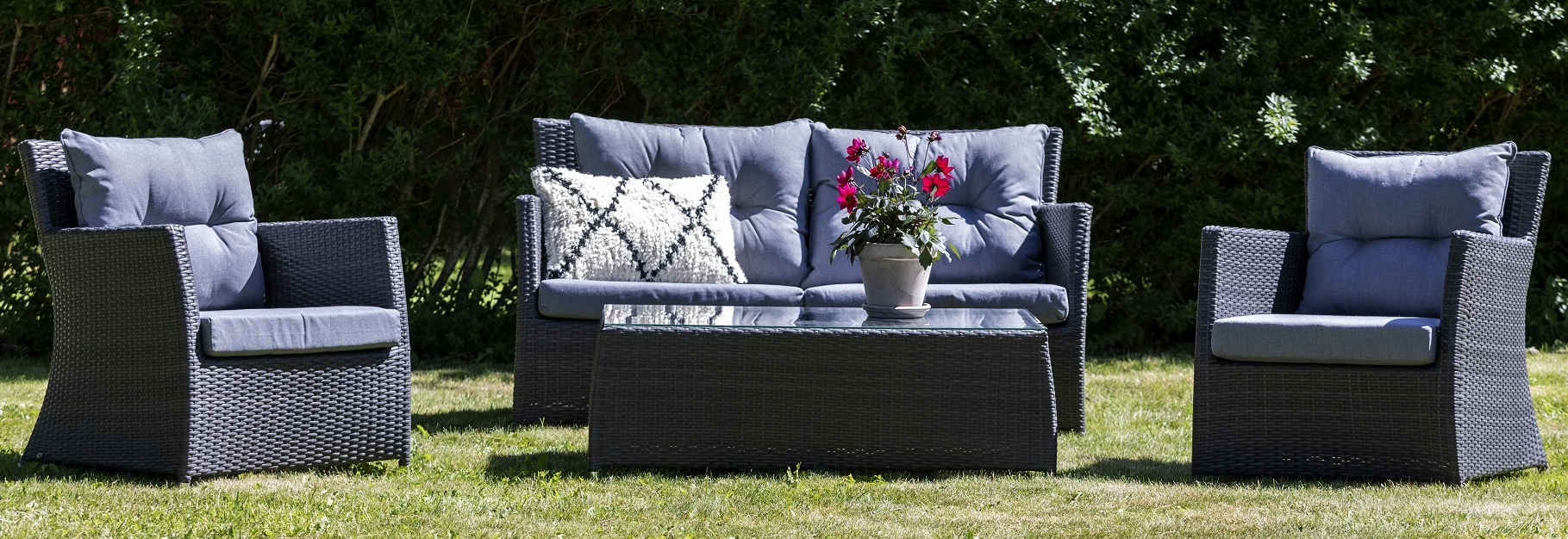 Utemöbelgrupp innehållande soffa, två fåtöljer samt ett bord. Hela setet är tillverkat i grå konstrotting med en stabil och vädertålig ram i aluminium. Bordet har en toppskiva av härdat glas.
