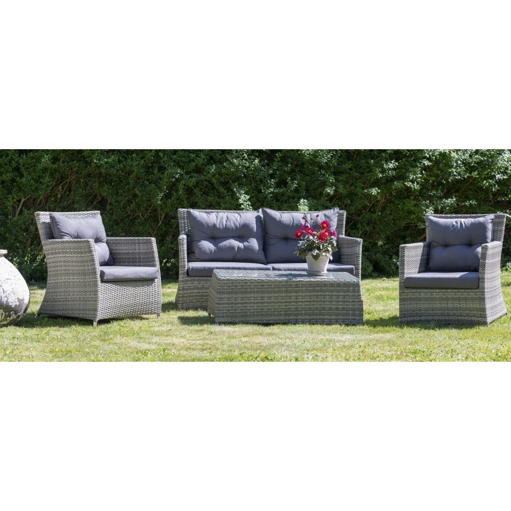 Utemöbelgrupp innehållande soffa, två fåtöljer samt ett bord. Hela setet är tillverkat i ljusgrå konstrotting med en stabil och vädertålig ram i aluminium. Bordet har en toppskiva av härdat glas.