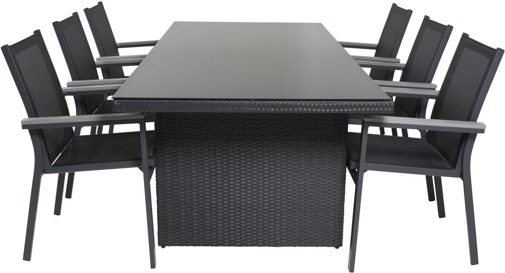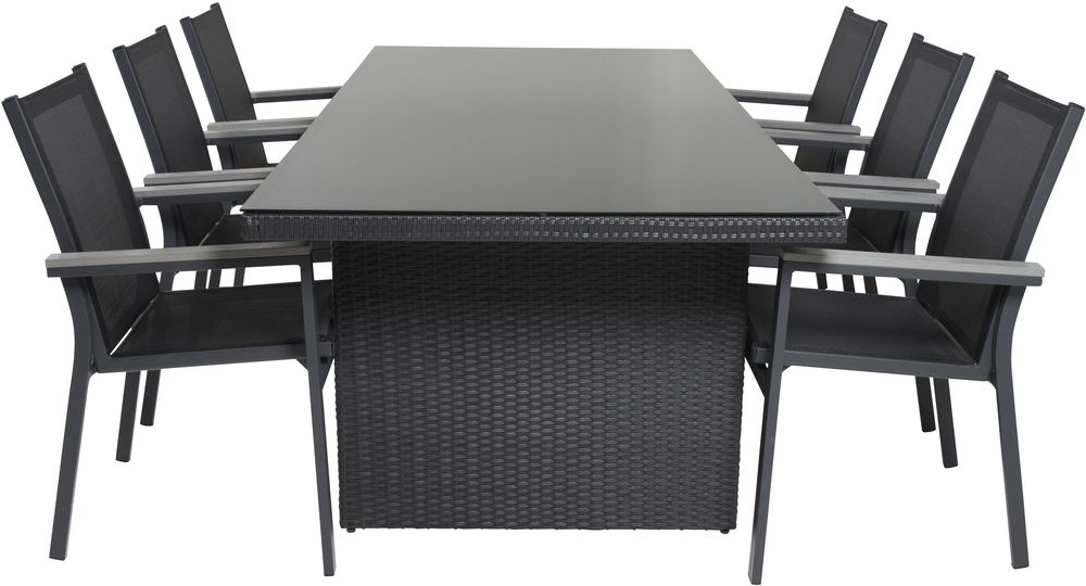 Matgrupp med ett bord och 6 stycken stolar. Stolarna är tillverkade av Aluminium/Aintwood/Textilene och bordet är tillverkat av Glas/Aluminium. Stolarna är stapelbara.